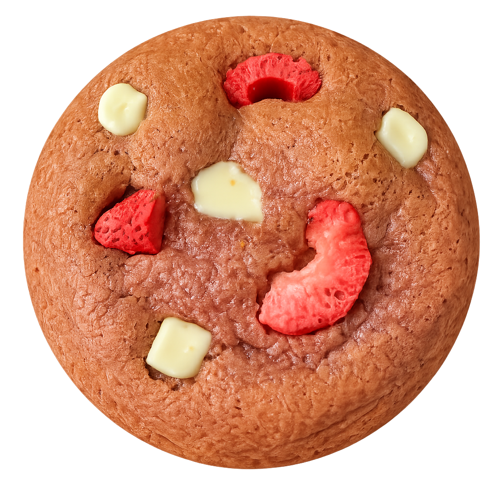 Creamy cookie infused with freeze-dried strawberries and white chocolate chunks, topped with frozen strawberry slices halfway through baking.